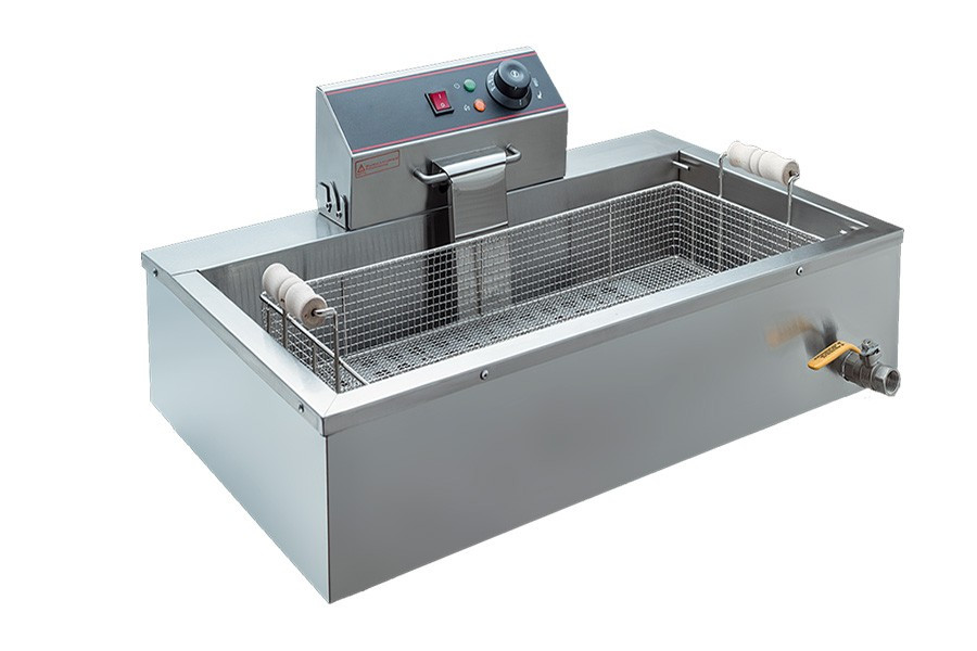 В конструкции предусмотрен специальный поддон с отверстиями для выкладки готовых изделий. Масло с поддона свободно стекает обратно в ванну, делая изделия менее жирными, а расход масла более экономичным.